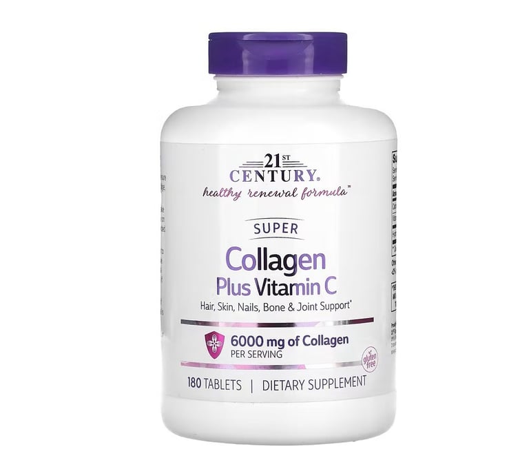 فيما يلي خيارات للمكملات الغذائية التي تحتوي على الكولاجين وفيتامين سي الذي يساهم في الحفاظ على صحة الجلد الطبيعية وفيتامين سي مهم لدوره في تكوين الكولاجين.